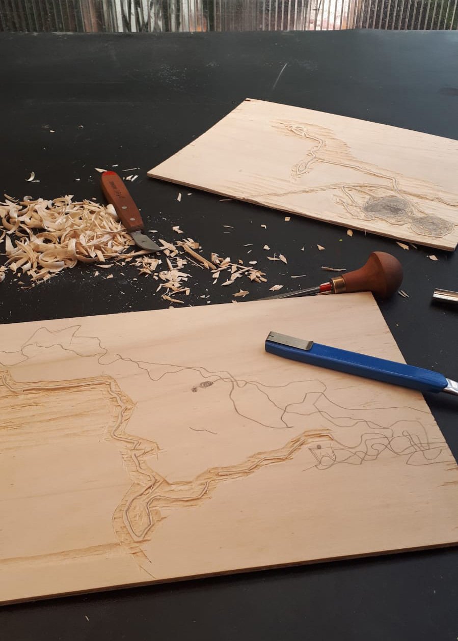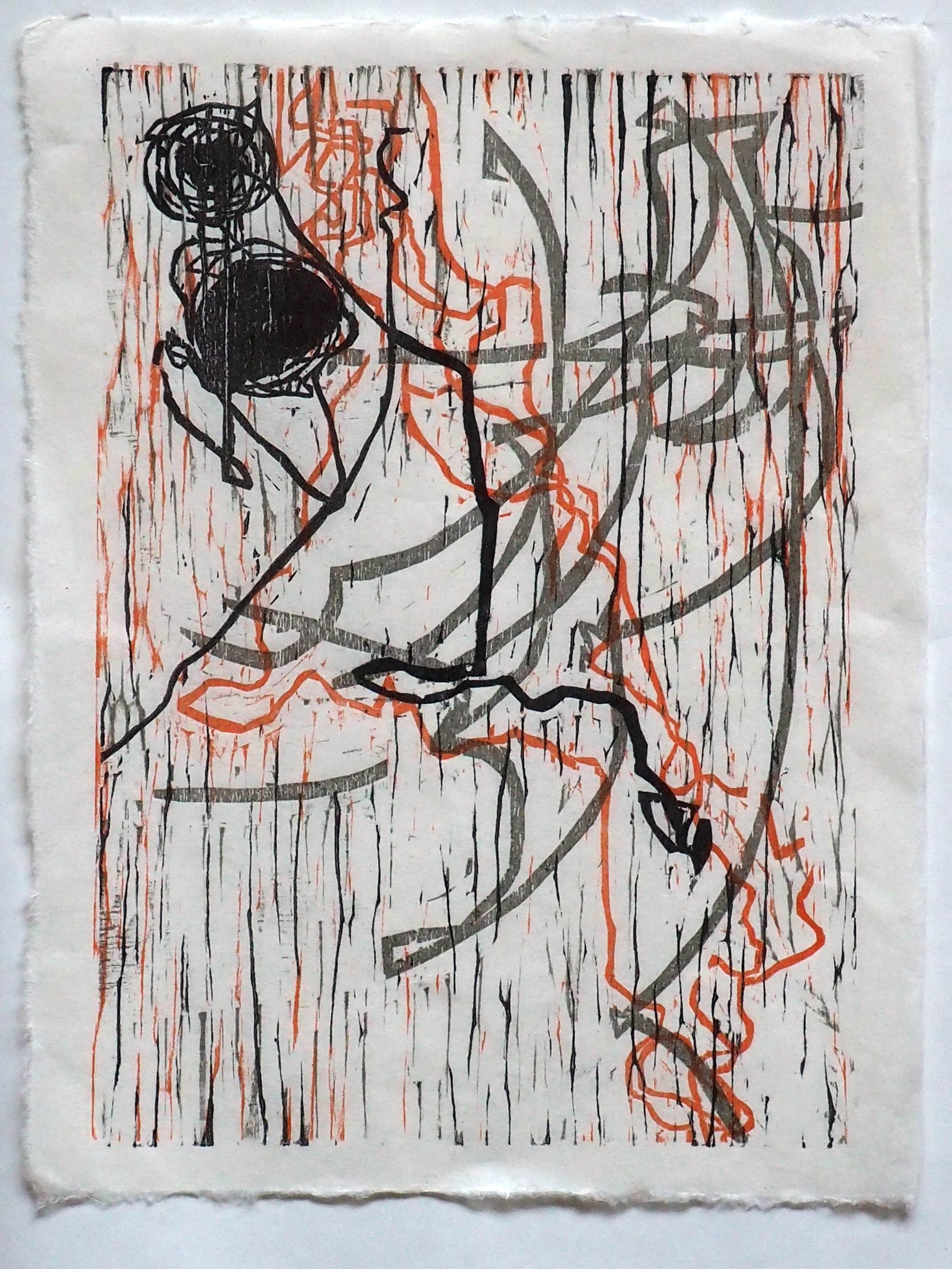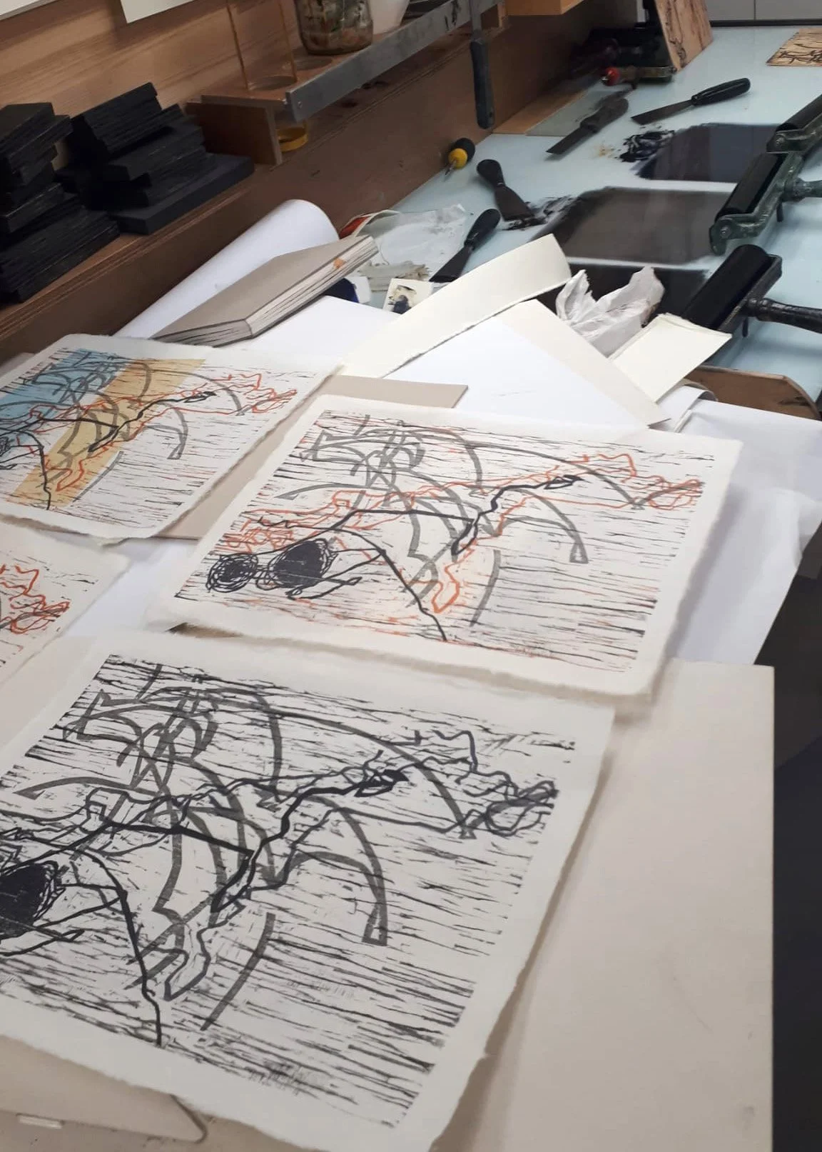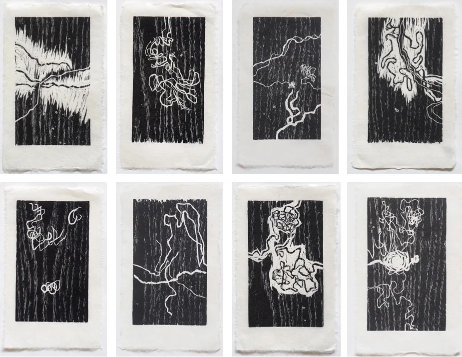 Developing these drawings into graphic works through printmaking offers a way of re-engaging with the experience of observing the firebug and of becoming more aware of the image-making process itself. When printing the woodblock, the grain of the wood emerges as an active agent [3], significantly shaping the final image. The physicality of engraving introduces a tactile dimension, transforming fleeting gestures into lasting marks. The act of carving becomes a form of embodied memory, reinforcing the presence and agency of the firebugs [4]. Through the repeated gestures of engraving, the initial movements are solidified, creating a layered process of engagement and reflection that deepens the connection between printmaker and firebugs.