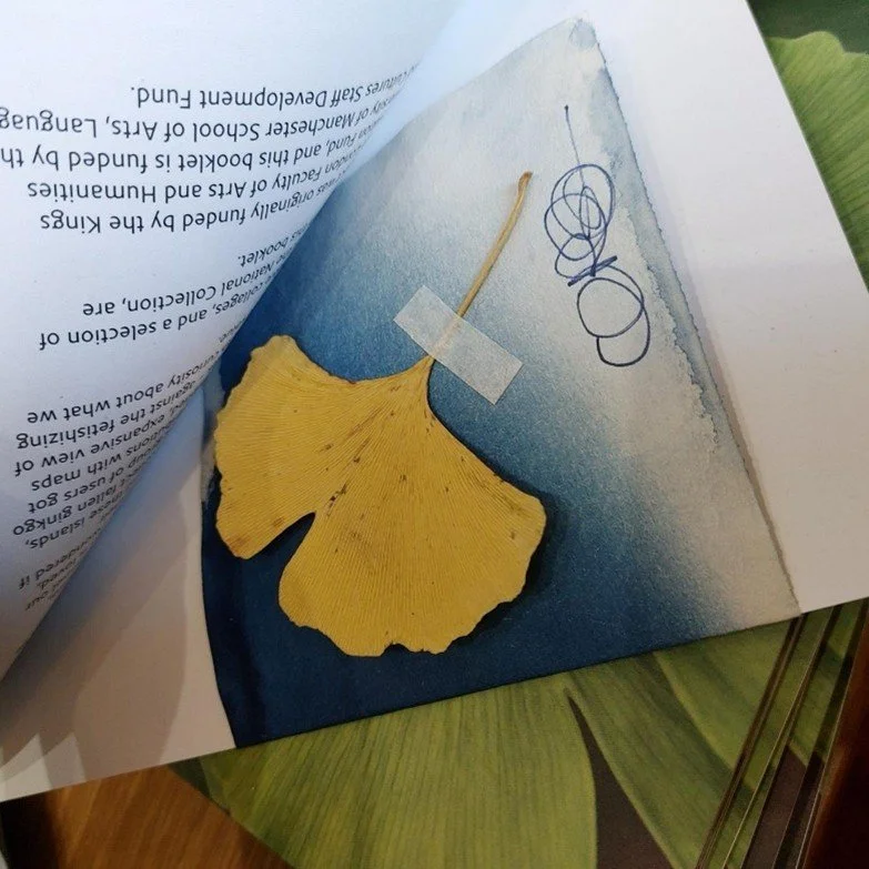 I collected ginkgo biloba leaves from the streets of Amsterdam the previous year, in an imagined connection with the first ginkgo that arrived in Europe and was brought to Leiden’s Hortus Botanicus (the botanical garden). Leiden is less than 50km from Amsterdam, and I wanted to make a material connection between the Netherlands and my project’s focus on the British Isles. I made cyanotype prints from the Amsterdam leaves, fashioning the prints into a kind of slipcover for each book.