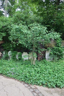 The Ginkgo grows at the southwest corner of the Garden, its thick trunk and meandering branches render visible the wise old age of this living fossil. The tree is subject to its own transformations, seasons and cycles and exists in relation to three centuries of Europe’s Social Histories. I walk up to the tree’s large trunk and embrace its resilient form. Around me, cover crops shoot shallow roots into the earth. English ivy winds its way through the foliage and fixates itself onto the ginkgo, meandering upwards. A moist climate and wet weather conditions invite green moss and lichen to take refuge on the ginkgo’s woody exterior. Large, entangled forms of the tree’s thick trunk spiral and branch outward to catch the sun’s rays. Steel wires tie together the most precarious of branches to decrease probability of the tree breaking in a storm. From the steel bands, I trace the outlines of one peculiar branch. From it, hangs a bushel of ginkgo seeds, hundreds of them’.[14]