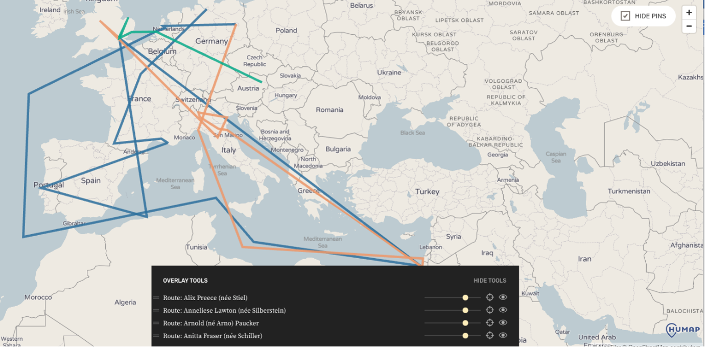 In December 2021, the Wiener Holocaust Library launched its Refugee Map on the Humap platform. This map tells the intimate stories of 200 refugees fleeing Nazi persecution in the 1930s and ‘40s, before, during and after the Second World War. In the same month, the news of hundreds of refugees arriving in Britain across the Channel made headlines, and today, thousands are fleeing war-torn Ukraine. Narratives of arrival are fraught with some of the same despair and hope. Journeys made under such extreme duress are impossible to imagine, but this map evocatively visualises those convoluted routes and to make the families and individuals that tread on them visible, along with the few items they carried. Within each record, pinned to the map can be found interviews and photographs, letters, reminiscences, official documents, as well as the stories of those who came - whether fleetingly or permanently.
