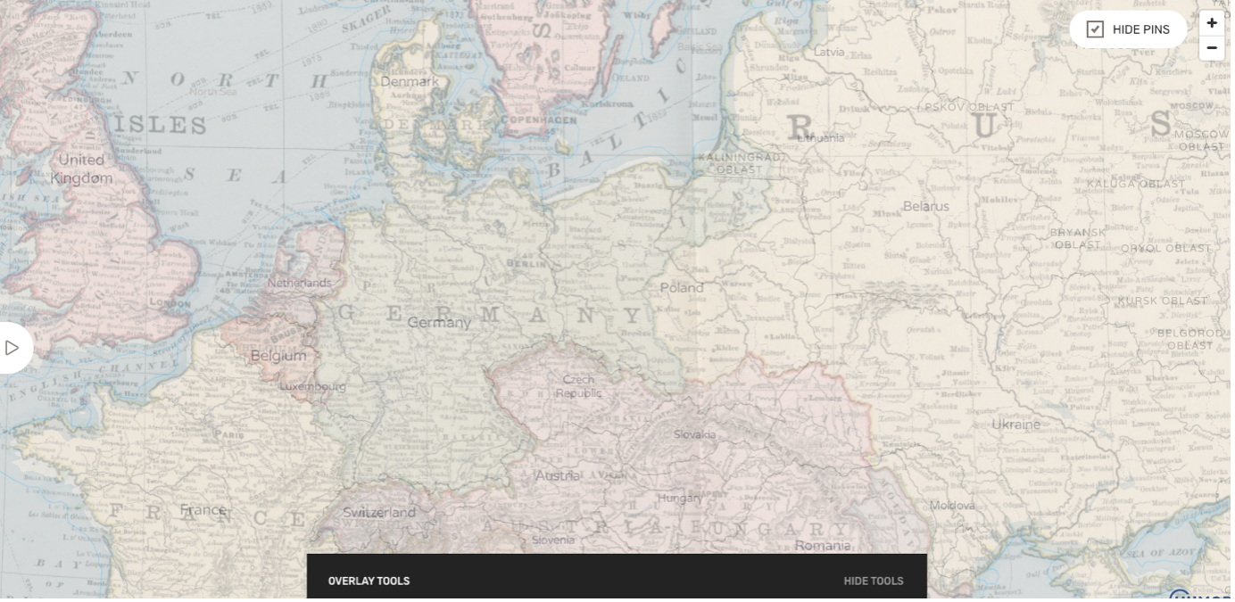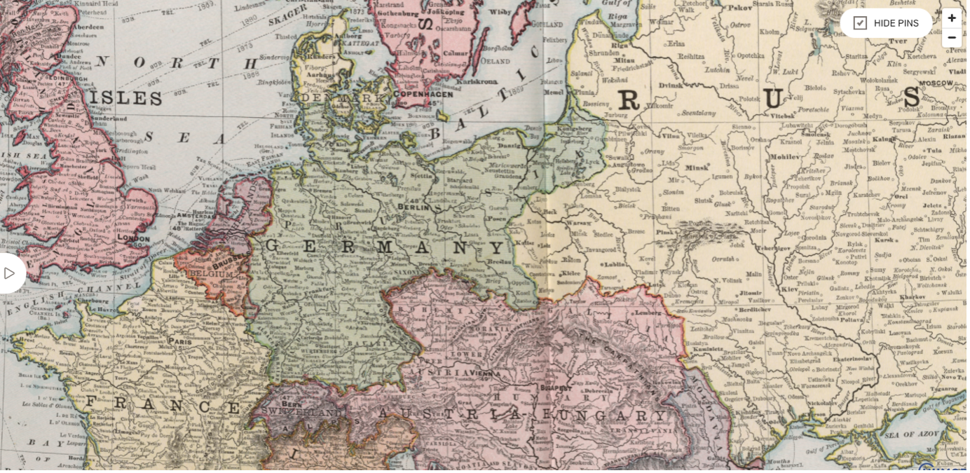 As well as the journey routes, the map is abundant in historic maps, geo-rectified over the base map. The 1912 map showing European borders is particularly useful for seeing the rise and fall of the great European powers over the past century. Poland’s loss and gain of lands since the war is very noticeable, along with the disappearance of the Austria-Hungarian empire.
