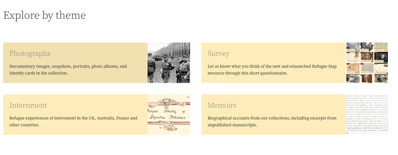 The addition of tags and collections helps the user to see at a glance everything associated with one theme or one person or family, especially as each person forms their own collection with their own attached records and routes. Links to the relevant parts of the Wiener Libraries’ catalogue are included, to help researchers go further if they wish. The map can also be explored thematically by artifact type such as photographs, documentary images, photo albums and identity cards and themes such as internment and memoirs in the form of biographical accounts from the collection including excerpts from unpublished manuscripts