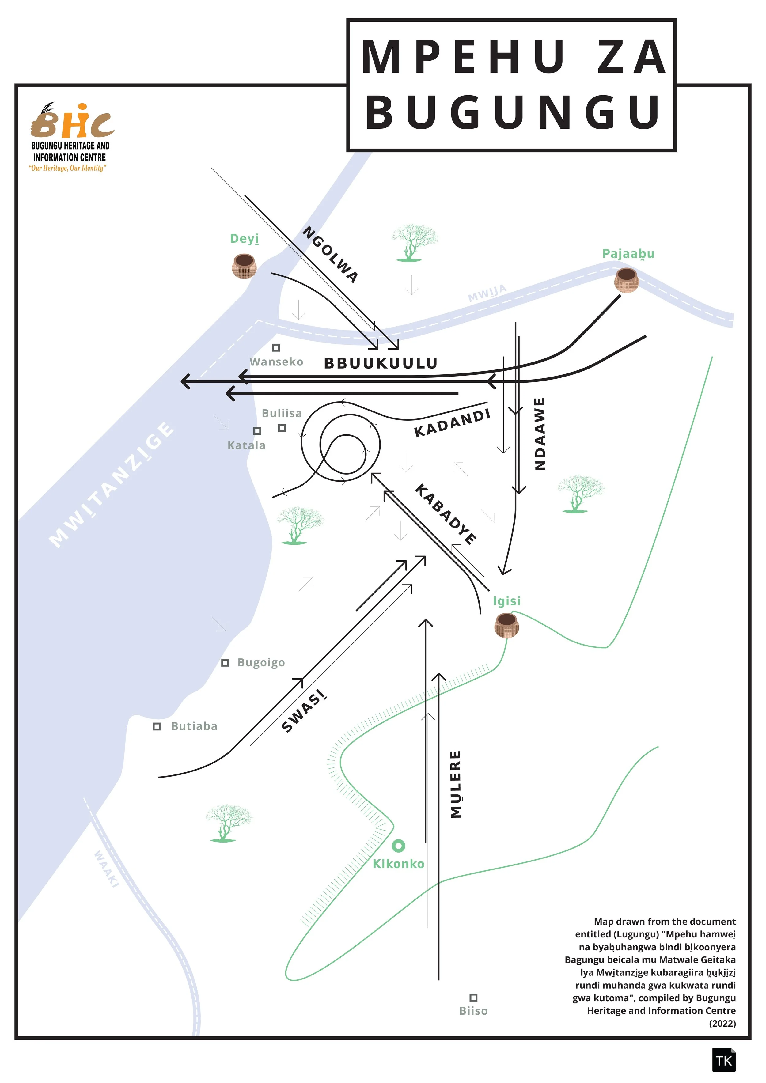 The Bagungu also use wind to navigate their territory; they will give direction by telling someone to see the direction that a certain wind blows to or from. Each wind blows from a specific direction. For example, when someone says ‘look in the direction of Mulere’, they mean look to the South.