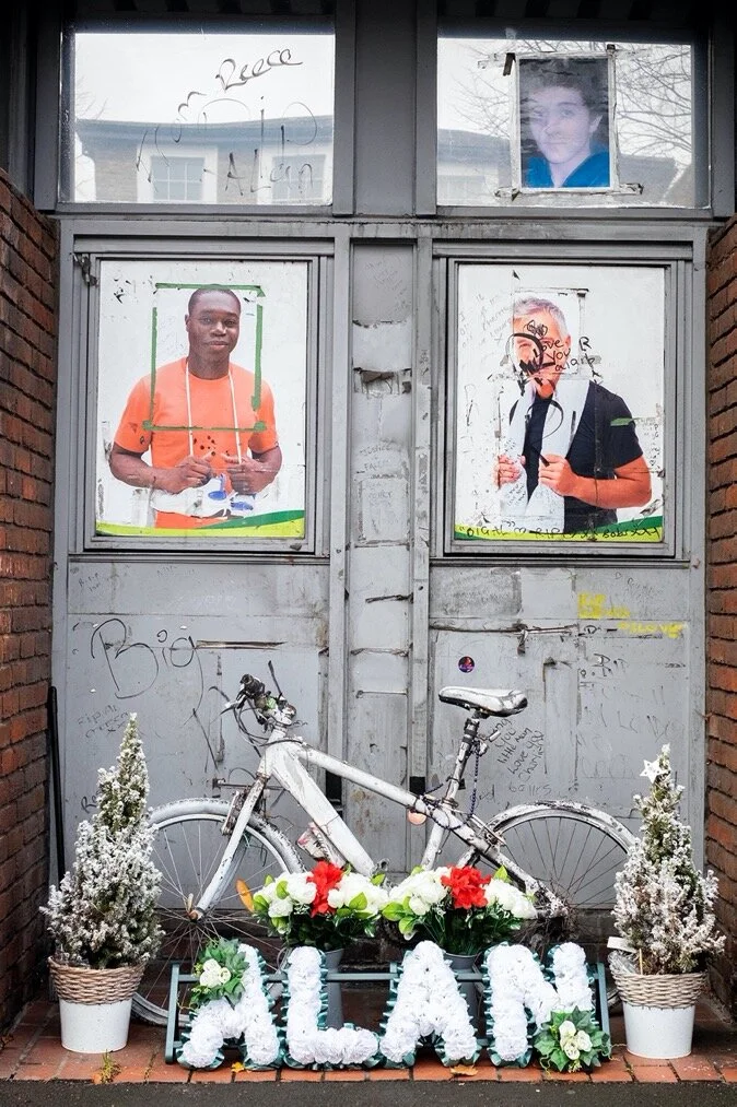 I photograph it and move on, stopping less than 100 metres further along. In an alcove along the exterior wall of Cally Pool and Gym, a painted white bike leans against the wall with the faded face of a teenager peering out from a photograph. The name A L A N is spelt out in plastic flowers along the floor. Painted white bikes, known as ghost bikes ‘are small and somber memorials for bicyclists who are killed or hit on the street. [....] They serve as reminders of the tragedy that took place on an otherwise anonymous street corner, and as quiet statements in support of cyclists' right to safe travel.’[7]