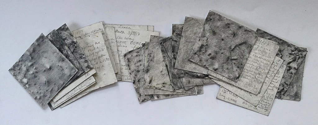 Before the pandemic and free to roam, I followed lines across landscapes, creating the work Groundlines. In lockdown, I made Puddle Worlds in the confines of my garden. Both works respond to and record traces of my surroundings: in Groundlines, through small square pencil on paper rubbings of the ground at intervals during each journey; in Puddle Worlds, through the repeated mapping of a puddle, tracing its outlines in ink, creating possible worlds to freely wander in my imagination.