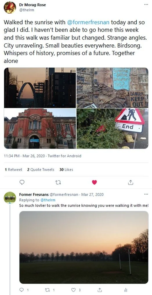The first season of walks was a hybrid experience of transnational sunrises: a few intrepid walkers joined me in person; even more joined me at a distance.